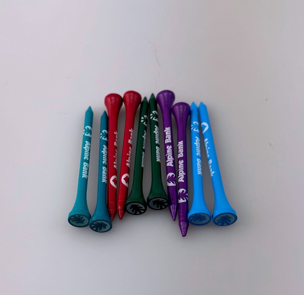 ASSORTED COLORS OF GOLF TEES WITH ALPINE BANK LOGO ON SHANK AND TREE ON CUP. PACKETS OF 10 TEES