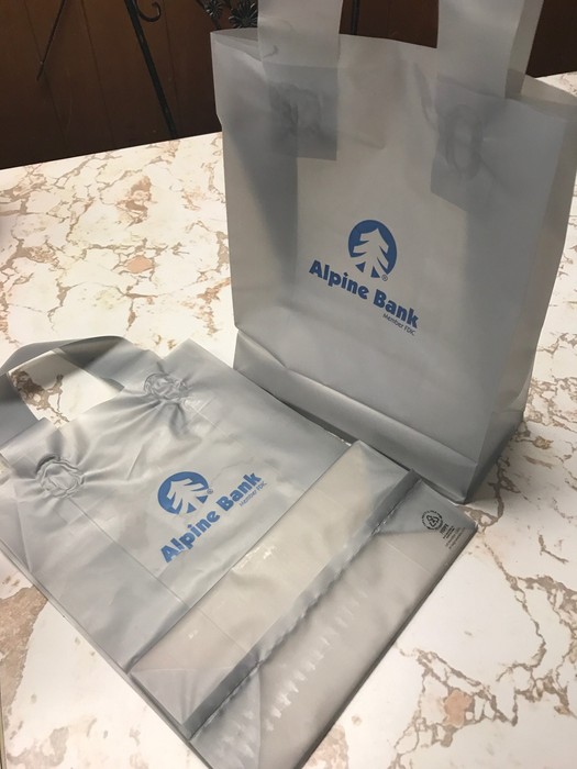 8x4x10" Hi-density 3.0 mil frosted color plastic bag with fused loop handle and cardboard bottom insert